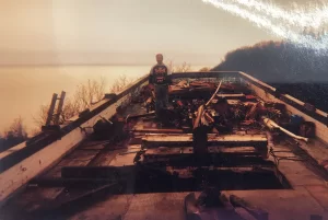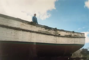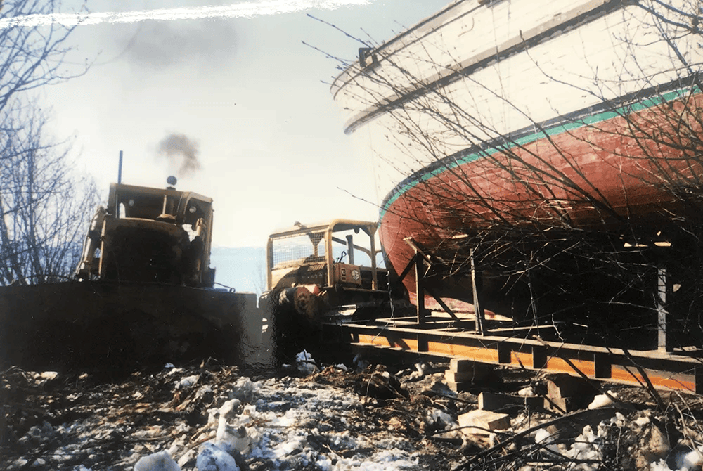 Moving the ship from the boat from the shipyard to its new home was quite an undertaking. The top half of the boat was taken off and set aside to be able to transport the boat on the roads and avoid the power lines. The bottom half of the boat made its way first to Baycrest Hill and was then slid down the driveway on snow during the winter season and then hoisted in place on steel pilings that were set in place in advance of its arrival. The top half of the boat was transported and reattached to the boat. It took over a year and a half to clean the debris off the ship, strip, and paint, and reconfigure all the interiors with plumbing, electricity, drywall, decks, and custom relocated staircases.